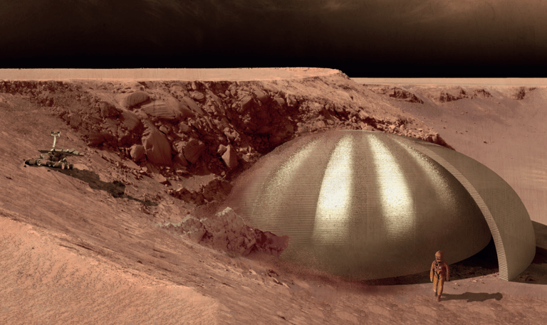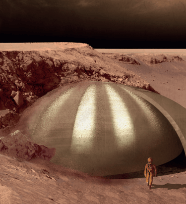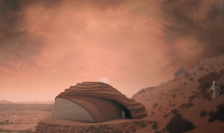 Un puesto avanzado en Marte, completamente cerrado, diseñado para misiones de larga duración. El hábitat combina una estructura protectora para el blindaje contra la radiación con la integración de sistemas de soporte vital, lo que permite operaciones autónomas y con tripulación en la superficie.